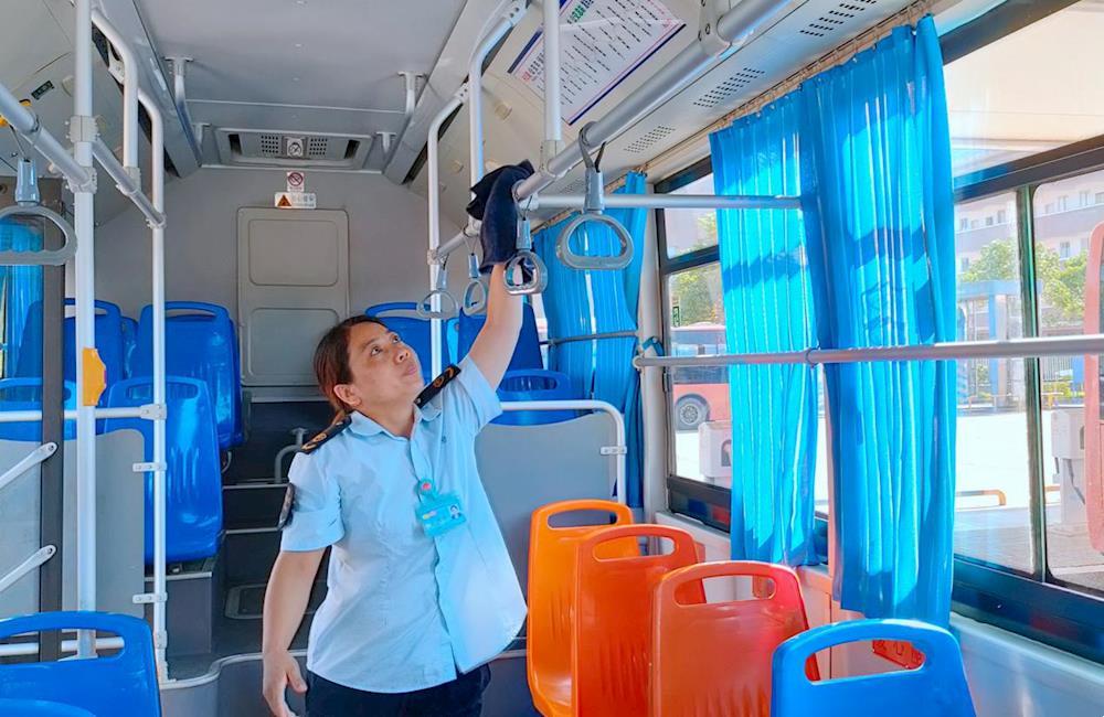 圖為H2線駕駛員李彥莉打掃車內(nèi)衛(wèi)生
